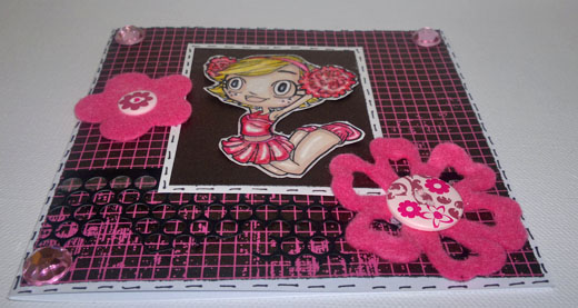 Jag tyckte om blommorna och knapparna och de passa bra till de här pappret jag hade i överskotts mappen. Färgen på hennes klänning är lika rosa men det ser lite rött ut på bilden. Tänkte sätta en grattis skylt men det får vara ifall jag tar med kortet till loppis, då får de som vill ha kortet själv skriva i det inne i kortet.